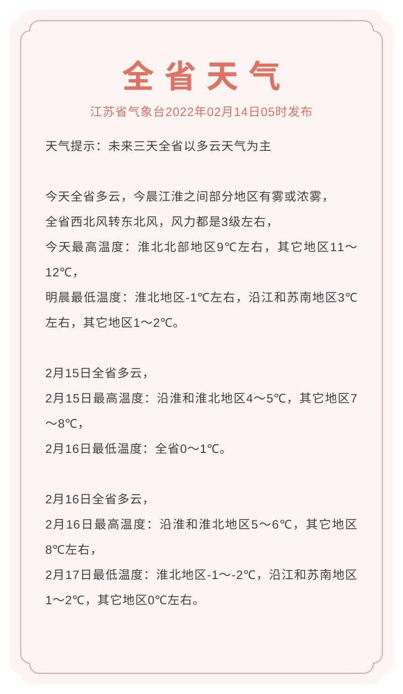 据江苏省气象台,今天(2月14日)全省多云,今晨江淮之间部分地区有雾或浓雾,全省西北风转东北风,风力都是3级左右,今天最高温度:淮北北部地区9℃左右,其它地区11~12℃,明晨最低温度:淮北地区-1℃左右,沿江和苏南地区3℃左右,其它地区1~2℃。