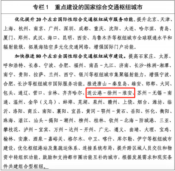 近日,国家五部门联合印发《现代综合交通枢纽体系“十四五”发展规划》,列出了“十四五”重点建设的20个国际性综合交通枢纽城市和80个全国性综合交通枢纽城市。淮安与连云港、徐州以城市组群的形式入选“十四五”重点打造的80个全国性综合交通枢纽城市。这也是国家发布的首个关于交通枢纽的专项规划。