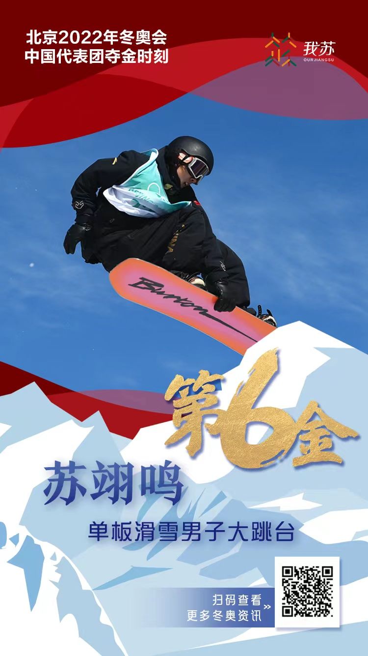北京冬奥会单板滑雪男子大跳台比赛,中国选手苏翊鸣夺得金牌,这是中国代表团在该项目上夺得的首枚冬奥会金牌!