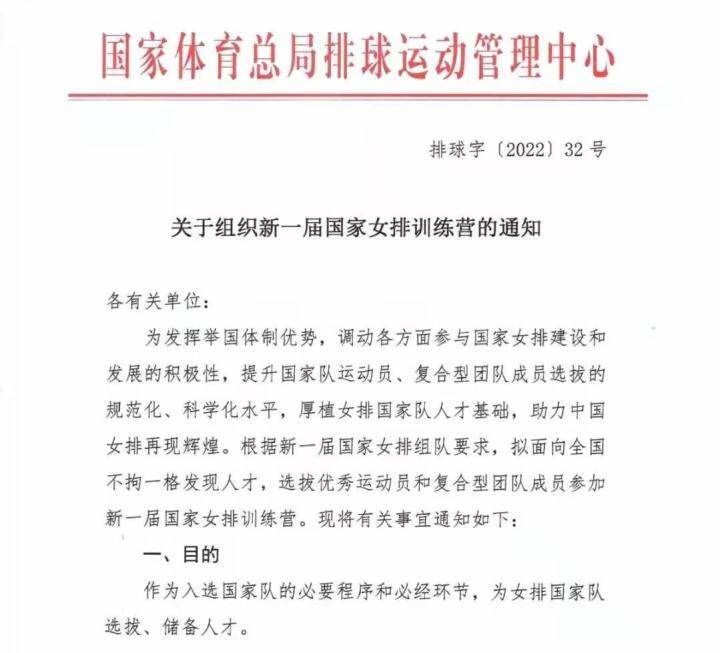 国家体育总局排球运动管理中心对外表示,根据新一届国家女排组队要求,拟面向全国不拘一格发现人才,选拔优秀运动员和复合型团队成员参与新一届国家女排训练营。原则上入选国家女排人才库的运动员均可参加训练营,非在库运动员可参加入营测试。