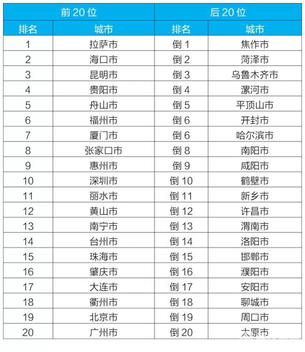 从168个重点城市空气质量排名看,拉萨、海口和昆明市等20个城市空气质量相对较好(从第1名至第20名);焦作、菏泽和乌鲁木齐市等20个城市空气质量相对较差(从倒数第1名至倒数第20名)。