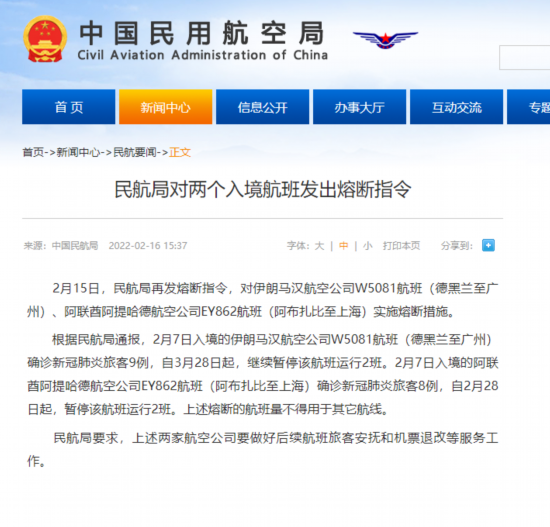 2月15日,民航局再发熔断指令,对伊朗马汉航空公司W5081航班(德黑兰至广州)、阿联酋阿提哈德航空公司EY862航班(阿布扎比至上海)实施熔断措施。