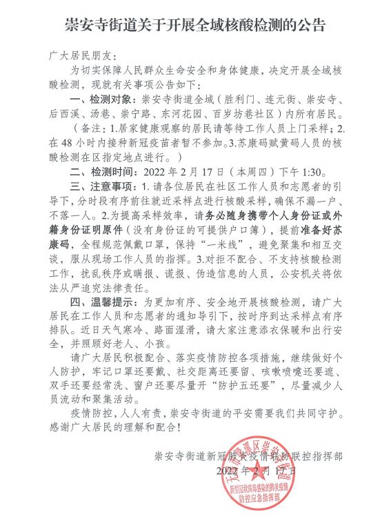 崇安寺街道关于开展全域核酸检测的公告