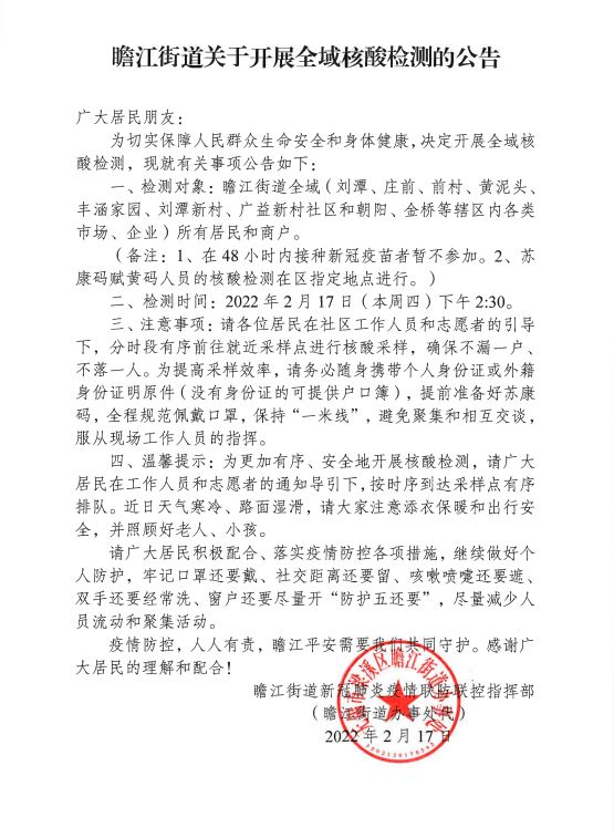 瞻江街道关于开展全域核酸检测的公告