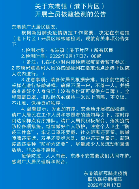 为科学精准有效做好东亭街道疫情防控工作,全面排查疫情风险,切实保障人民群众生命安全和身体健康,东亭街道新冠肺炎疫情联防联控指挥部定于2022年2月17日晚7:00左右在辖区范围内有序开展全员核酸检测。现将有关事宜通告如下: