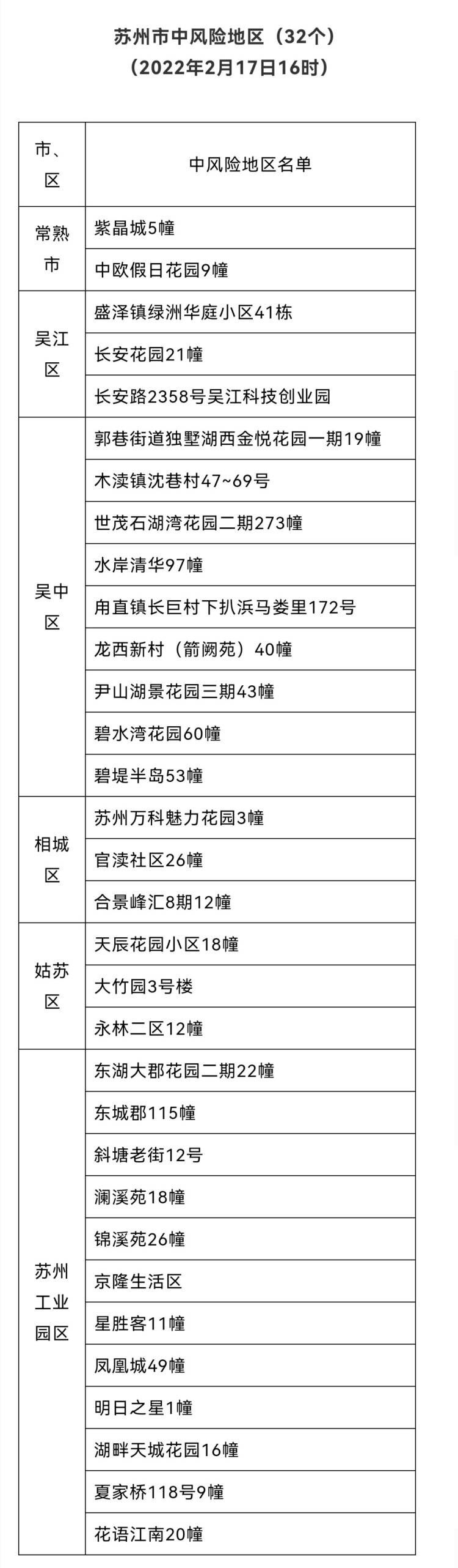 根据国务院联防联控机制有关规定,经专家咨询组综合评估研判,市指挥部决定,自2022年2月17日16时起,将吴江区长安路2358号吴江科技创业园、姑苏区永林二区12幢、苏州工业园区花语江南20幢等地调整为中风险地区,其他地区风险等级不变。