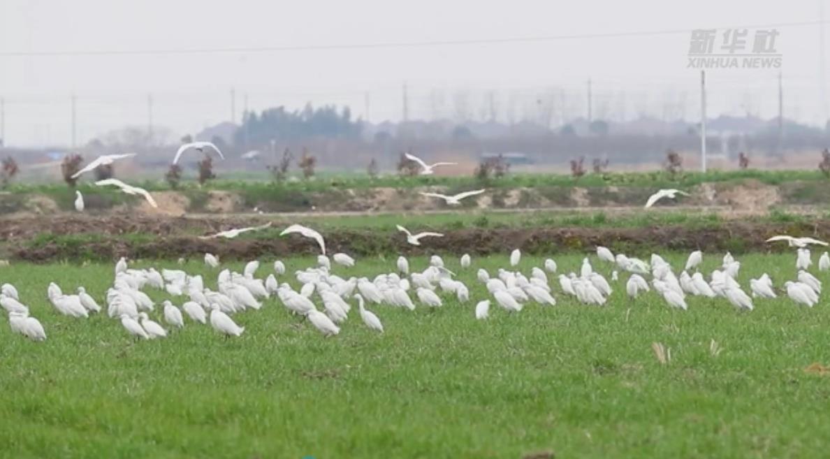 2月16日,江苏省兴化市千垛镇杨家村东侧的麦田里,成千只白鹭来这里驻足栖息。初春时节,它们时而在麦田觅食,时而在空中飞翔,悠然、轻盈的身体留下优美而自由的弧线。
