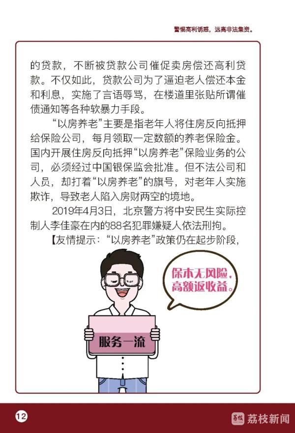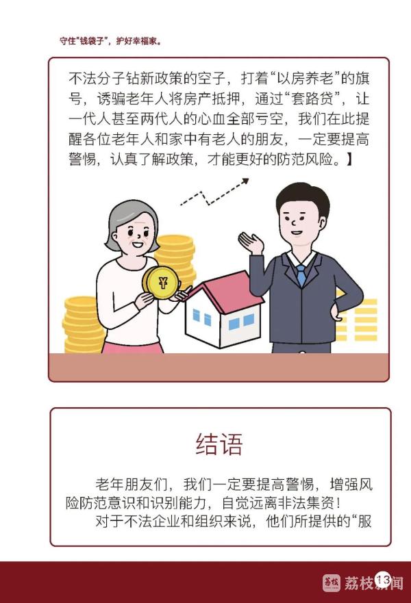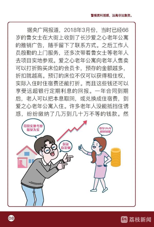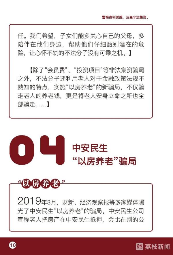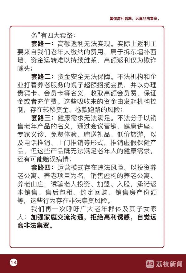 倡议书提醒老年人,要认清养老服务领域非法集资的本质与危害,非法集资是指未经国务院金融管理部门依法许可或者违反国家金融管理规定,以许诺还本付息或者给予其他投资回报等方式,向不特定对象吸收资金的行为,危害性极大,资金往往被非法集资人、非法集资协助人挥霍、隐藏、转移或携带逃匿,事发后追讨困难。要识别非法集资的主要形式与特点,提防以提供养老服务、投资养老项目、销售老年产品用品、收取高额预付费等名义和形式吸纳资金的骗局,不断提高识别能力,警惕“天上掉馅饼”的“好事”,谨防上当受骗。