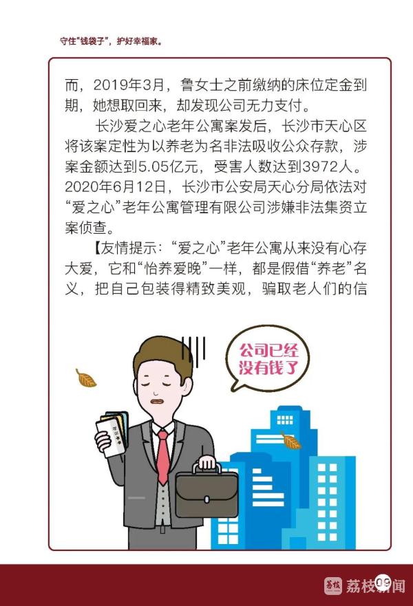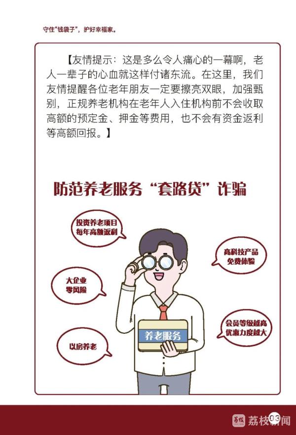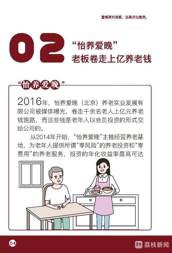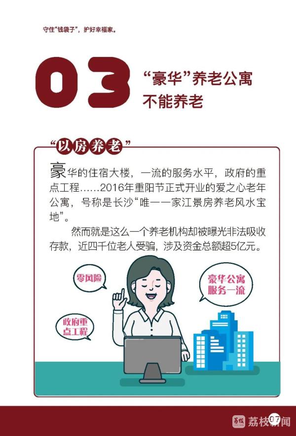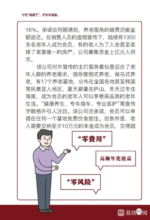 倡议书指出,老年人有机构养老需求的,应选择在登记管理机关进行法人登记并在民政部门完成备案的养老机构,签订服务协议,明确护理等级、服务内容、服务方式,约定收费标准和费用支付方式,明确服务场所、协议变更、解除与终止的条件等权利和义务。应理性选择合法合规的投资理财渠道,不要轻信高额回报,谨慎对待高于银行利率的投资项目,切勿轻易预付高额养老服务费用,进行大笔金额支付时,多与家人沟通,切勿轻信他人。