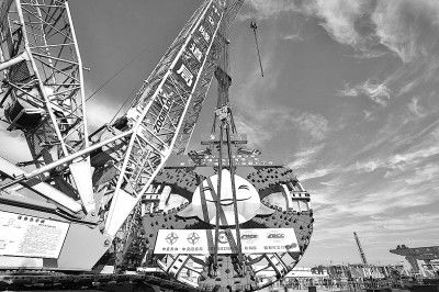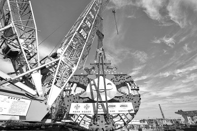 江苏省江阴靖江长江隧道路线全长11825米,是目前国内直径最大、在建承受水压最高的超大直径隧道。由中交隧道局承建的隧道左线盾构段长4937.19米,采用目前国内最先进、智能化水平最高的超大直径盾构机“聚力一号”进行掘进施工。图为2月21日,工人对“聚力一号”刀盘进行安装。汤德宏摄/光明图片