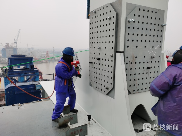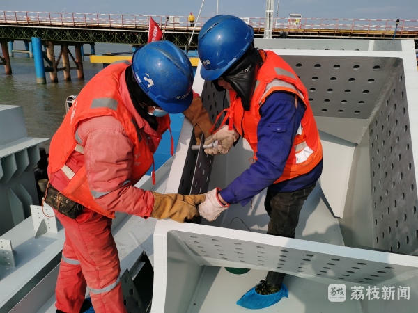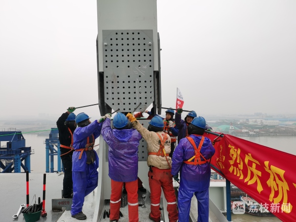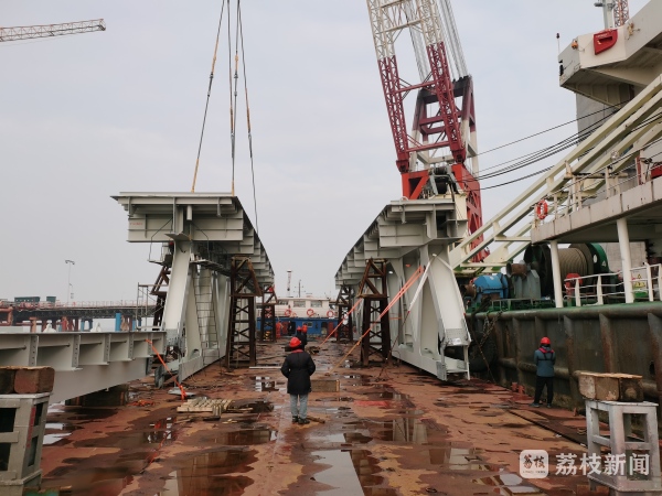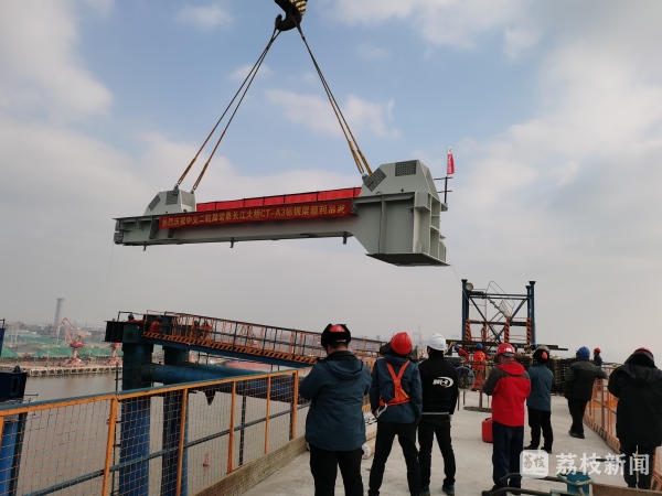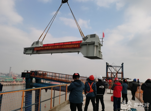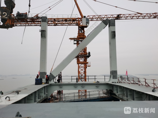 我苏网讯 目前,常泰长江大桥天星洲航道桥首节间钢梁杆件顺利吊装完成。