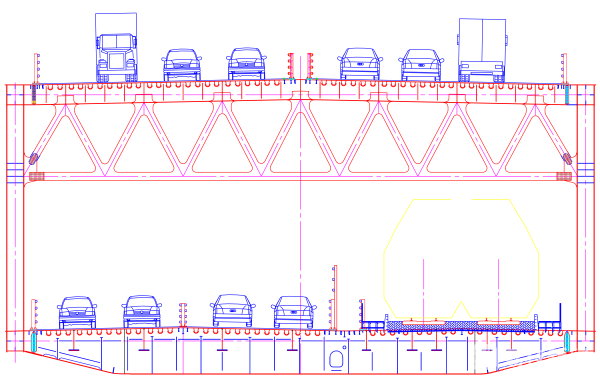 上层布置双向6车道高速公路,下层桥面上游侧布置两线城际铁路,下游侧布置4车道普通公路,是目前在建世界最大跨度公铁两用双层钢桁梁拱桥。