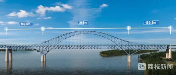 常泰长江大桥天星洲专用航道桥为三跨连续钢桁拱桥,跨径布置为169.5米+388米+169.5米双层桥面。