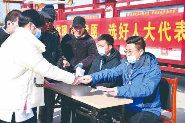 山东省临沂市郯城县县乡人大代表换届选举投票日,工作人员在马头镇马东选区投票站发放“选民证”。(图片来源:人民视觉)