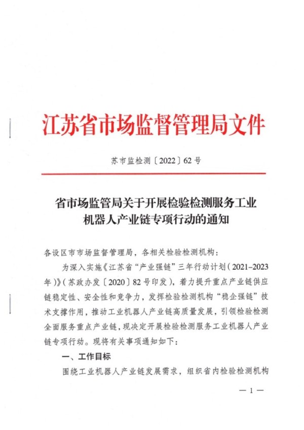 我苏网讯 记者今天(3月7日)从省市场监管局获悉,为深入实施《江苏省“产业强链”三年行动计划(2021-2023年)》,聚焦“稳企强链”发挥检验检测技术支撑作用,江苏省市场监管局印发通知,在全省开展检验检测服务工业机器人产业链专项行动。该行动是落实省政府关于“产业强链”行动计划的具体实践,是推进制造强省、质量强省建设的切实举措。