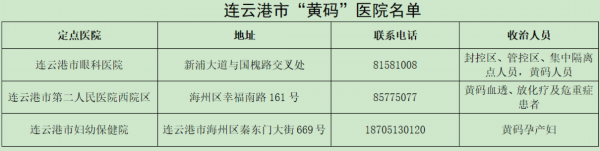 目前,海州区范围已设立3家“黄码医院”,分别为连云港市眼科医院、连云港市第二人民医院西院区、连云港市妇幼保健院。其中,连云港市第二人民医院西院区为血透、放化疗及危重症黄码患者定点医院,连云港市妇幼保健院为黄码孕产妇定点医院。
