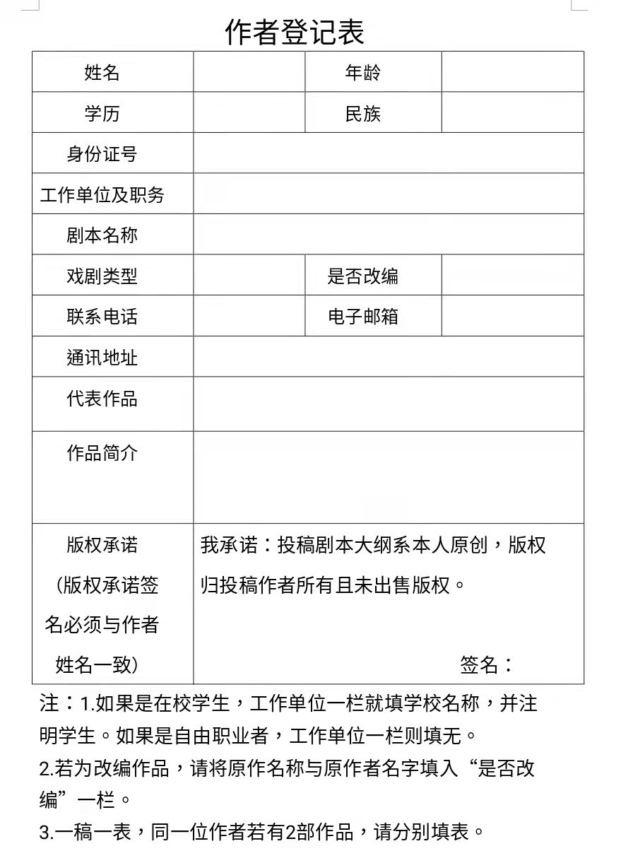2.《作者登记表》、剧本大纲以及相关资料电子版发送至邮箱jsjbfhzx@163.com(请务必在电子邮件的标题栏注明江苏省戏剧剧本大纲征集、作者姓名、大纲名称)。