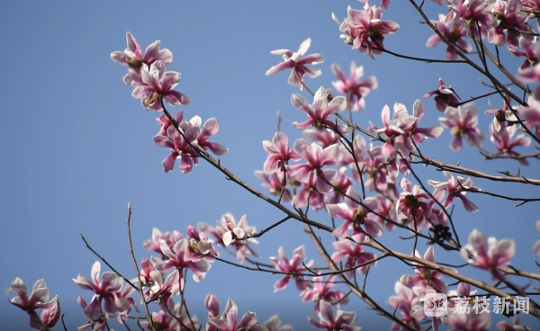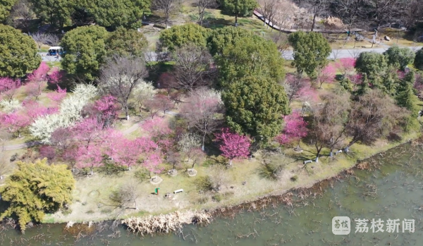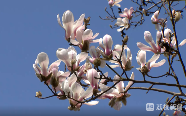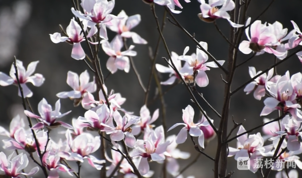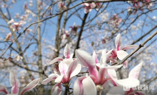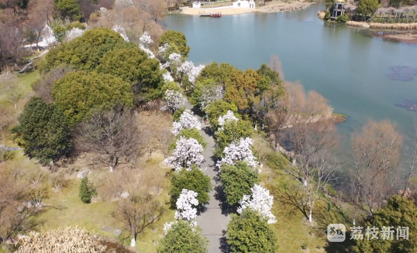 在苏州中国花卉植物园,玉兰花进入盛花期。记者看到,沿着河边,高大的玉兰树上,粉白色的花朵挂满枝头,明媚亮丽。不远处,红梅也不甘示弱,连成了粉色的花海。