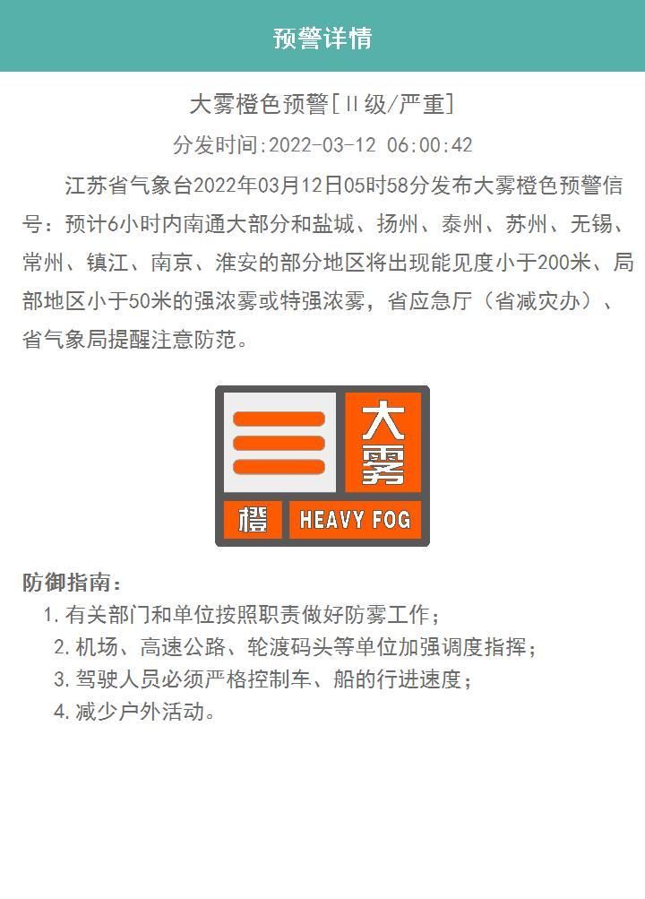 今晨05时58分,江苏省气象台发布大雾橙色预警信号:预计6小时内南通大部分和盐城、扬州、泰州、苏州、无锡、常州、镇江、南京、淮安的部分地区将出现能见度小于200米、局部地区小于50米的强浓雾或特强浓雾,省应急厅(省减灾办)、省气象局提醒注意防范。