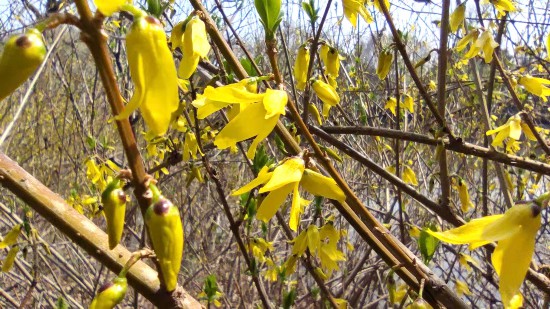 眼下,金钟花也跟紫叶李一样,部分已进入盛花期,全部进入盛花期也就是这一两天的事儿。扬州金钟花也多沿河而植,金黄色的花朵,鲜艳明亮。