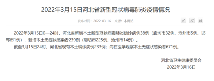 我苏网讯 3月16日河北省卫健委发布,2022年3月15日0—24时,河北省新增本土新型冠状病毒肺炎确诊病例38例(廊坊市32例、沧州市5例、邯郸市1例),新增本土无症状感染者239例(廊坊市225例、沧州市14例)。