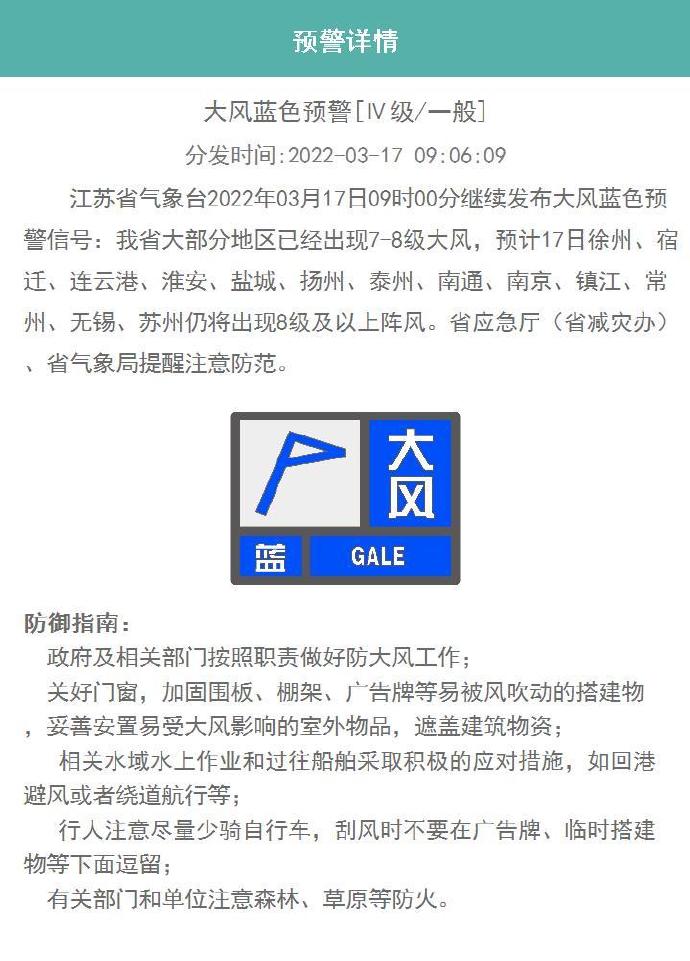 我苏网讯 江苏省气象台2022年03月17日09时00分继续发布大风蓝色预警信号:我省大部分地区已经出现7-8级大风,预计17日徐州、宿迁、连云港、淮安、盐城、扬州、泰州、南通、南京、镇江、常州、无锡、苏州仍将出现8级及以上阵风。省应急厅(省减灾办)、省气象局提醒注意防范。