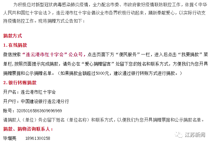 连云港市红十字会接收社会捐赠的方式,已经通过连云港市红十字会官方公众号等渠道发布,感谢大家的关注!