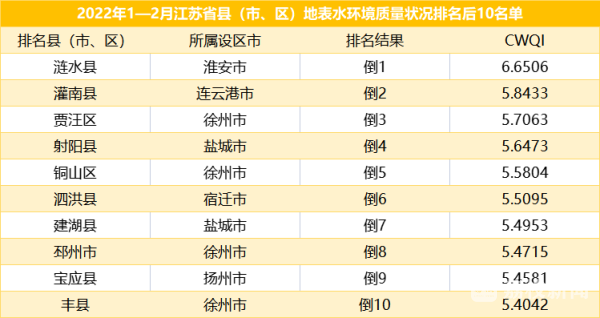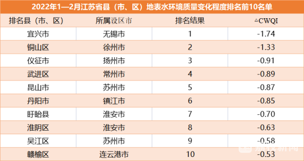 地表水环境质量改善幅度相对较快的前10位(1—10名)依次是:宜兴市、铜山区、仪征市、武进区、昆山市、丹阳市、盱眙县、淮阴区、吴江区、赣榆区;