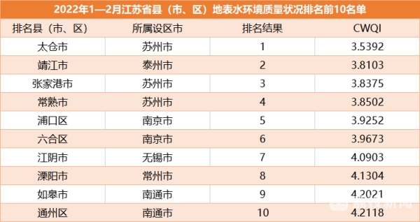 地表水环境质量相对较好的前10位(1—10名)依次是:太仓市、靖江市、张家港市、常熟市、浦口区、六合区、江阴市、溧阳市、如皋市、通州区;