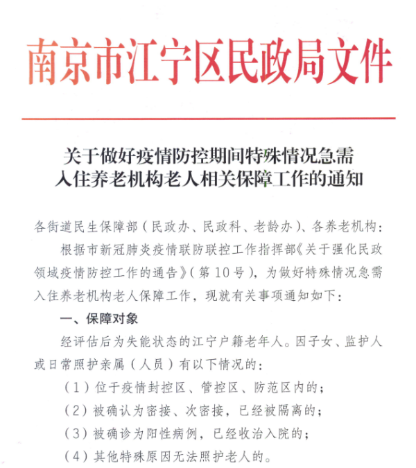 我苏网讯 今天(3月18日),记者从南京市江宁区民政局获悉,在疫情防控期间,失能状态的江宁户籍老人如果因为子女、监护人或日常照护亲属被隔离或者其他特殊原因无法照顾老人的,可安排老人紧急入住养老机构,并享受15天的财政补贴。
