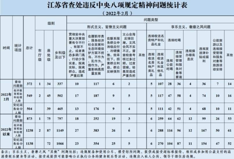 2022年2月,全省共查处违反中央八项规定精神问题372起,批评教育帮助和处理549人、其中给予党纪政务处分504人。从问题类型看,查处形式主义、官僚主义问题135起、批评教育帮助和处理218人,查处享乐主义、奢靡之风问题237起、批评教育帮助和处理331人。从人员级别看,批评教育帮助和处理厅局级领导干部2人、县处级干部45人、乡科级及以下人员502人。