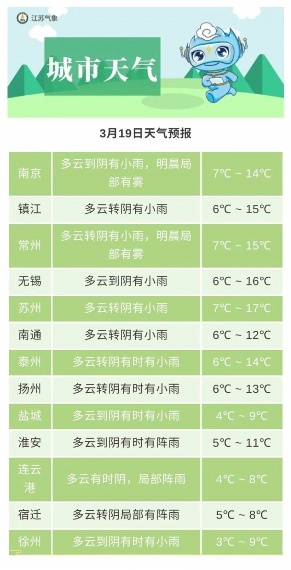 今天白天全省多云到阴,部分地区有小雨,夜里沿江和苏南地区阴有小雨,其它地区多云到阴,全省东北风4-5级阵风6级,今天最高温度:沿江和苏南地区13~14℃,其它地区10℃左右,明晨最低温度:苏南地区5~6℃,其它地区3℃左右。