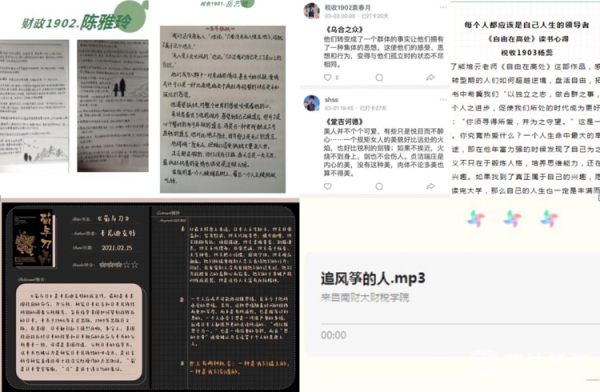 据了解,南京财经大学财政与税务学院同期开启了“与春书”自由阅读展打卡通道,鼓励同学们通过手抄书、音频等多种形式,将自己的小感触、小奇思随时随地记录下来,每日通过微信小程序打卡,养成阅读和记录的好习惯。同学们踊跃分享自己的心得体会,在自我思考的同时也为其他同学的感悟所打动。