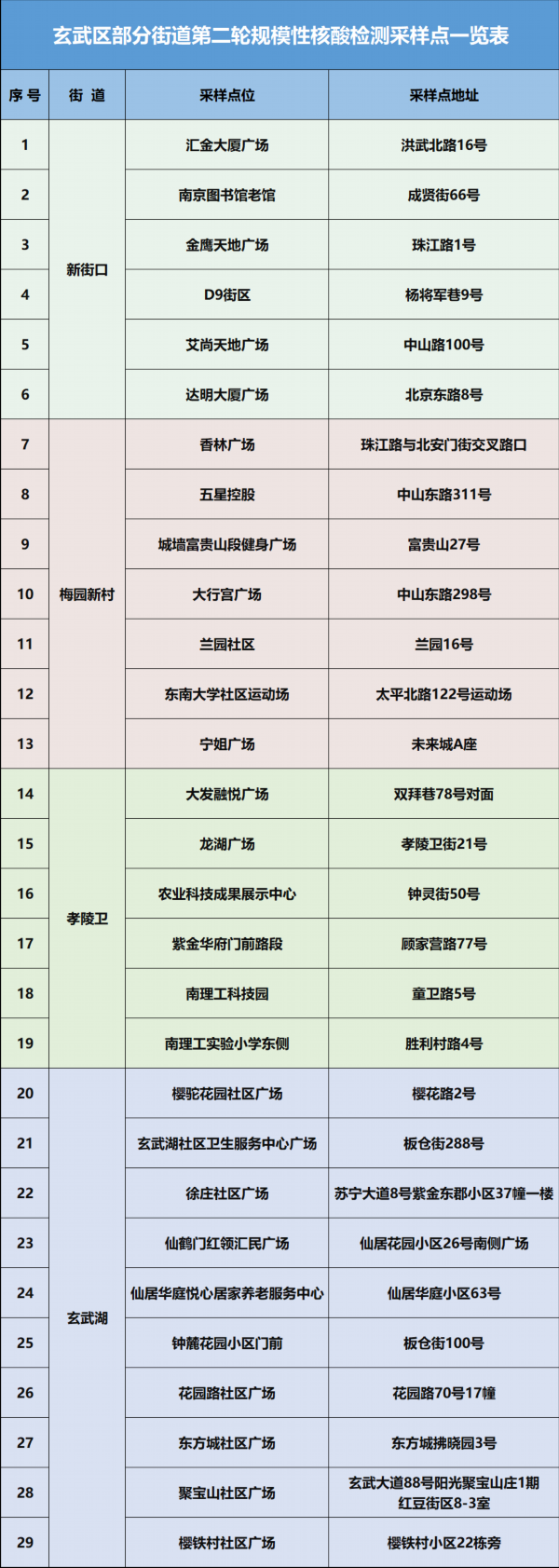 附:新街口街道、梅园新村街道、孝陵卫街道、玄武湖街道核酸检测采样点一览表