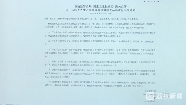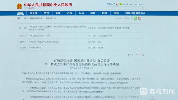 市场监管总局、国家卫健委、海关总署联合发布的《关于依法查处生产经营含金银箔粉食品违法行为的通知》指出:"金箔类物质不是食品添加剂,不能用于食品生产经营","食品生产者不得采购使用金银箔粉生产加工食品,食品销售者不得采购销售含金银箔粉食品,餐饮服务提供者不得制作售卖含金银箔粉餐食。""相关违法行为一经查实,一律依法从严从重从快查处;涉嫌犯罪的,一律依法移送公安机关追究刑事责任。"