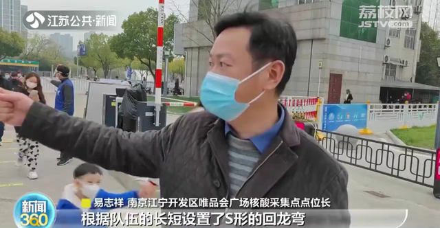 南京江宁开发区唯品会广场核酸采集点点位长易志祥说:“根据队伍的长短设置了S形的回龙弯,让大家有足够的空间保持一米距离,我们现场请了10个志愿者队员,有二十几个,有卡口维持秩序的,有测温验码的,有进行录入的,包括垃圾处置的。”