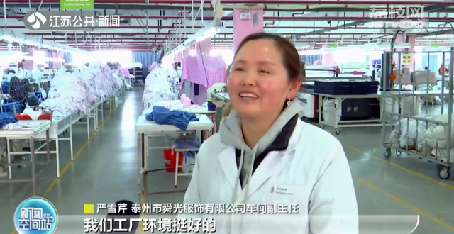 泰州市舜光服饰有限公司车间副主任严雪芹表示:“我们工厂环境很好,每天都提供免费的工作餐,还买相应的保险,试用期满了以后,平均年收入工资在6万元左右,节假日、中秋、三八节,过年的时候都有礼品福利。”
