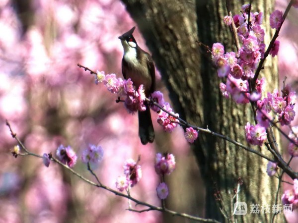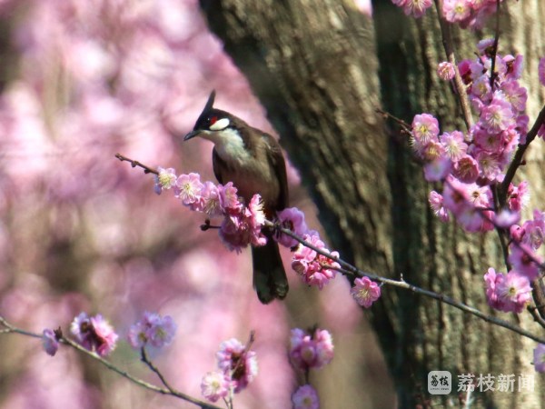 3月20日春分,在南京紫金山的梅花丛林中,飞来了一群可爱的红耳鹎“贵宾”安家。这些红耳鹎常在枝间跳上跳下,或在树间飞来飞去,红耳鹎长约为20厘米,通体为暗灰色,但耳朵部分有一缀红色羽毛,这也是辨认它们的标志。红耳鹎鸟春天喜爱觅食梅花粉,它的出现引起拍鸟市民驻足观赏,十分惊喜。
