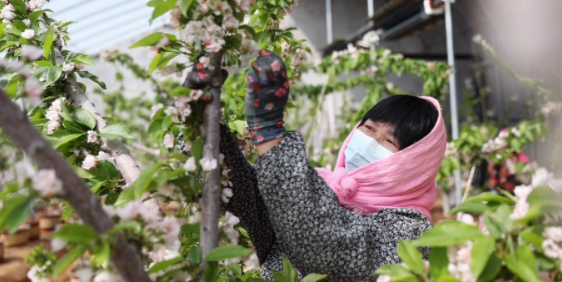 3月24日上午,在连云港市赣榆区厉庄镇谢湖村的樱桃种植大棚内,一簇簇洁白的花朵挂满枝头,果农正忙着给果树疏花,确保大棚樱桃丰产丰收。