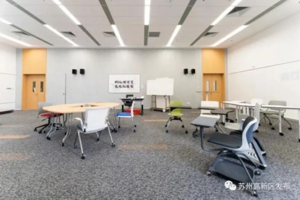 走出生活化的宿舍区域,教学区域也充满了浓厚的现代气息与人文关怀。苏州校区教室均铺设地毯,使用无尘黑板。考虑到师生的电子设备使用需求,阶梯教室课桌均配有插座,研讨室安装有可移动插座。