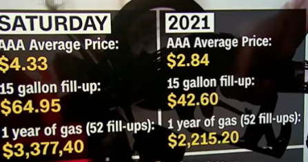 CNN主播:“如果你的汽车油箱是15加仑(约60升)的容量。加满一箱油需要65美元,一年下来的话,即便你一周只加一次油,一年要花超过3300美元。这与一年前相比,要多花1700美元。”