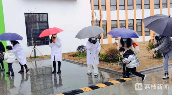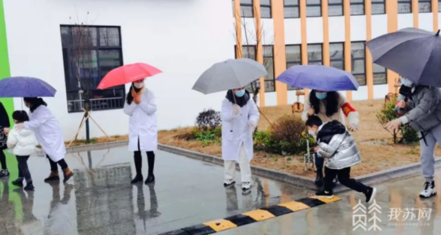 因疫情防控原因,幼儿家长们接送孩子不能进入校园,幼儿园老师们需要提前到园门口迎送。滨海县实验幼儿园的老师们为了不让孩子被雨淋湿,她们自发用雨伞接力,为孩子们撑起了一个特殊的通道。