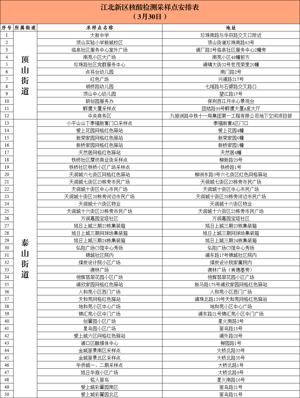 我苏网讯 3月29日,南京江北新区新冠肺炎疫情联防联控工作指挥部发布关于在顶山街道全域、泰山街道部分社区开展核酸检测的通告。全文如下: