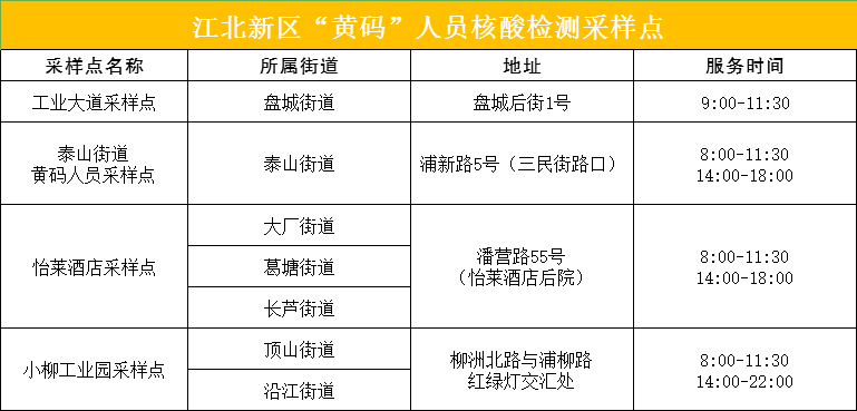 2. 健康码黄码人员请到街道指定采样点采样(详见下表)。顶山街道封控区人员按照要求落实核酸采样,管控区人员请在管控区内采样。其他重点人员请持街道证明到指定采样点采样。