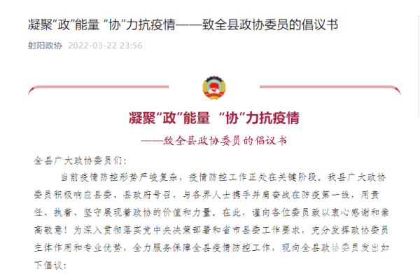 越是艰难时刻,越要发挥制度优势,越能体现政协作用。“要统一思想、听从指挥,团结一心、众志成城,以强烈的责任担当、有力的防控举措,全力守护人民群众生命安全和社会稳定发展大局。”射阳县政协第一时间发出疫情防控倡议书,号召广大政协委员牢固树立政治意识、大局意识,充分发挥政协委员主体作用和专业优势,凝聚全民抗击疫情的共识与合力。