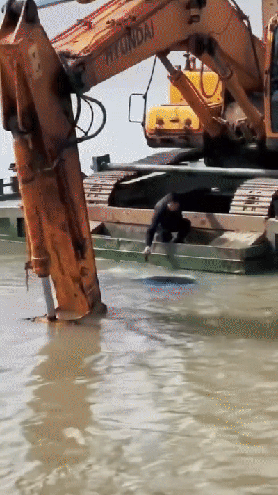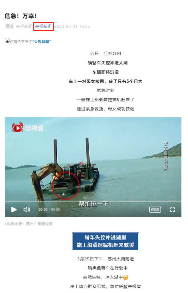 3月29日下午,苏州太湖附近,一辆黑色轿车在行驶中突然失控,冲入湖中。岸上热心群众见状,急忙呼救并报警,但由于车辆距离岸边有数米,大家都束手无策。眼看轿车不断下沉,即将没顶,危急时刻,湖面不远处正进行施工作业的姚万顺听到呼救,立即驾船赶来救援。万幸的是,施工船上正好搭载了一辆挖掘机,驾驶员顾建志马上操控挖掘机,将即将沉没的轿车打捞出水面。