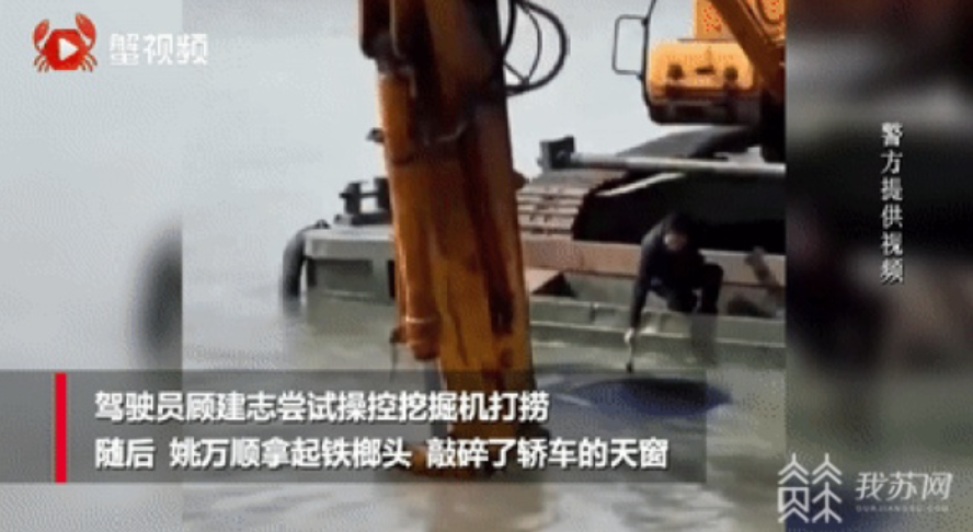 但由于湖面风力很大,车辆出水不久,再次滑落,顾建志用铲斗控制车身延缓其下沉,姚万顺急中生智,用铁锤将车辆的后挡风玻璃敲破。