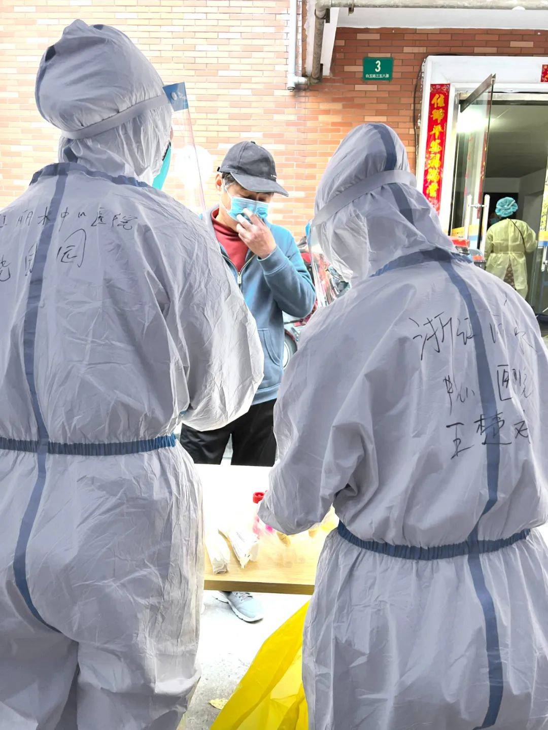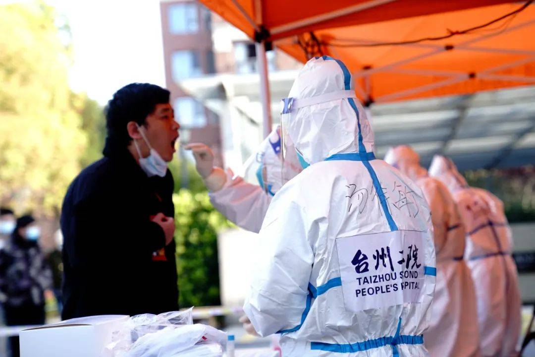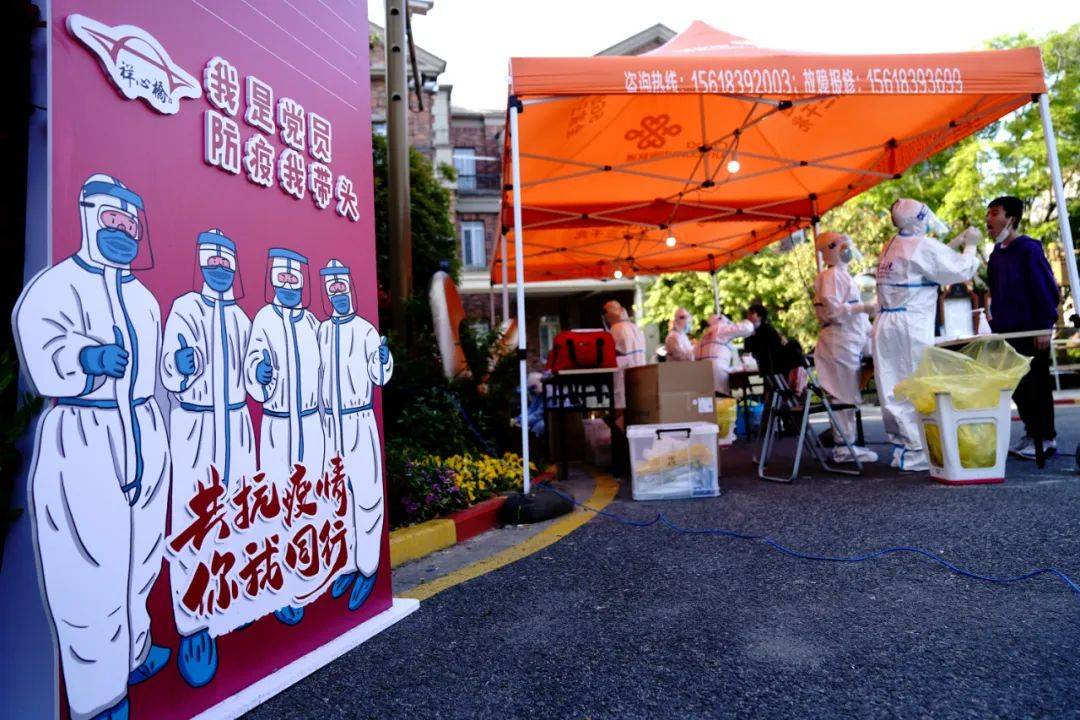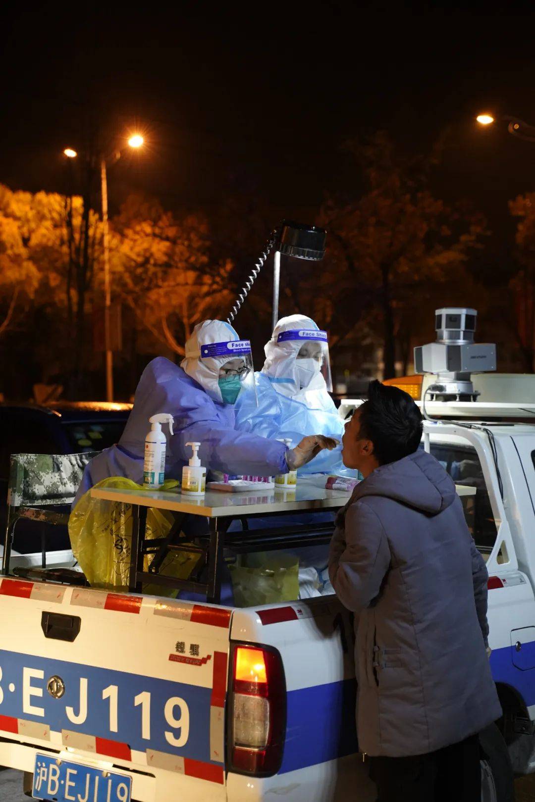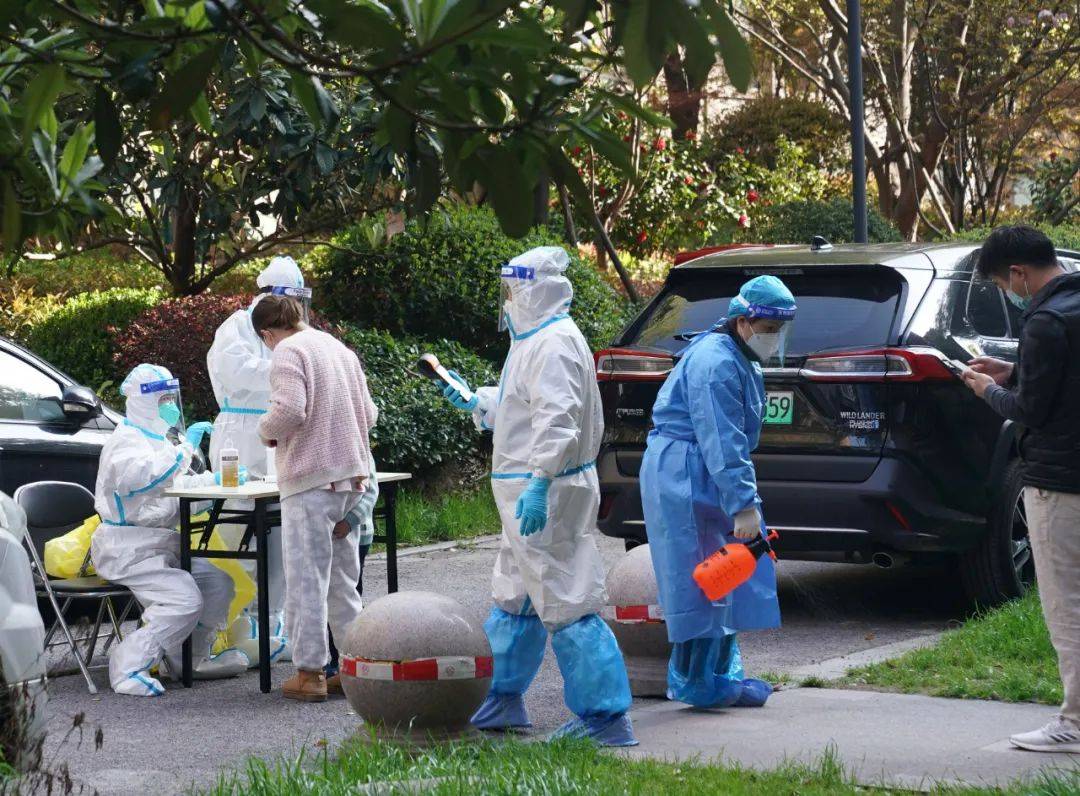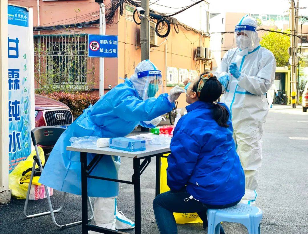 4月4日,检测人员在徐汇区漕河泾街道一小区内为居民进行核酸采样。(徐盛珉 摄)