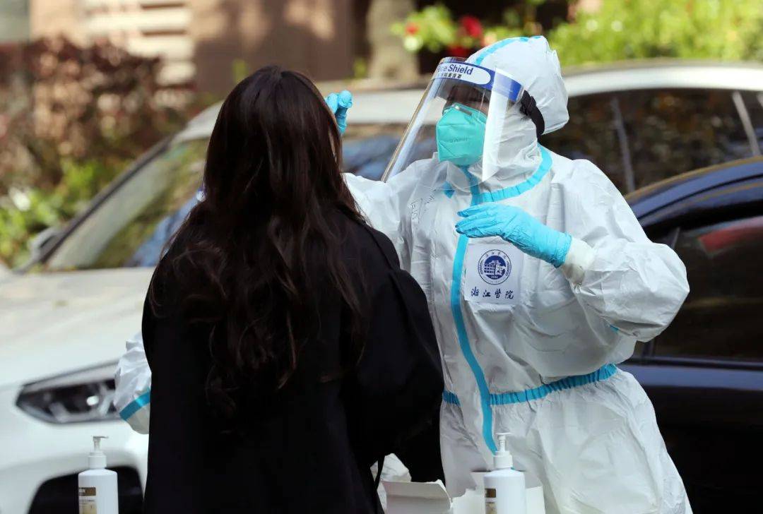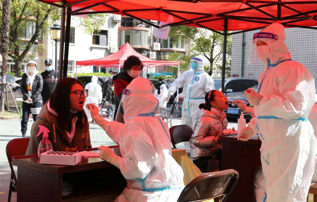 4月4日,在普陀区白玉苑小区,来自浙江丽水的医疗队为小区居民进行核酸采样。新华社发(郑非非 摄)