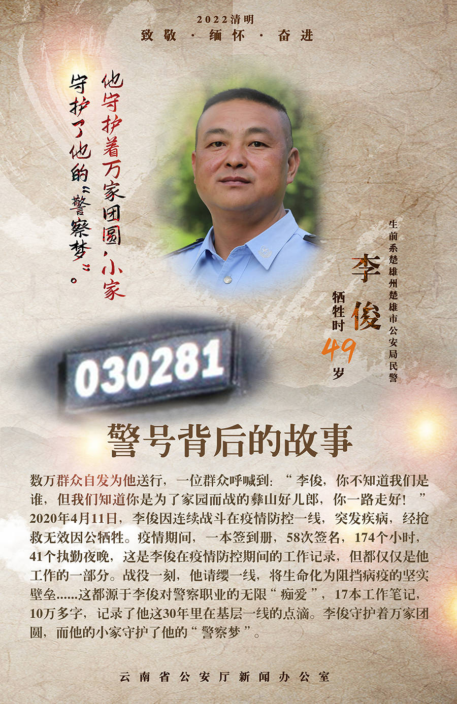 2020年4月11日,李俊因连续战斗在疫情防控一线,突发疾病,经抢救无效因公牺牲。疫情期间,一本签到册,58次签名,174个小时,41个执勤夜晚,这是李俊在疫情防控期间的工作记录,但都仅仅是他工作的一部分。